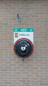 Inmiddels heeft de AED een mooi plekje gekregen aan de kantine onder de overkapping.